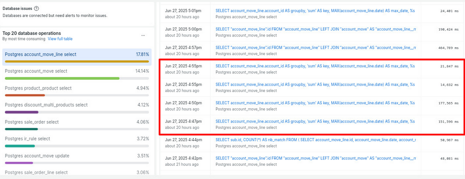 Qué pasó. Al abrir apuntes con filtros y ejecutar procesos contables, múltiples consultas a account_move y account_move_line entraron en lock wait y se bloquearon entre sí. Impacto: UI > 2 min, errores 502. Acciones: abortar consultas y reinicio.